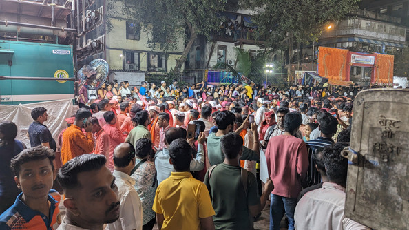 At last we caught sight of the bright lights of Lal Baug! We couldn’t see the idol since it was behind the blinding lights but it was still so far away! We estimated it might be a whole hour before it passed us. This was my first time experiencing the Mumbai crowds and it was such an experience. I climbed up on the center barrier just to be able to capture the sea of people who had come out to celebrate. We got scared when two army buses came racing through the crowds and hoped that it meant the Lal Baug was near, but it sadly did not.