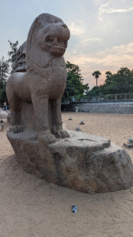Anjali and I were itching to explore already so we hired an auto and had him take us to whatever temples were still open. He suggested doing the 5 Rathas (Pancha Rathas), the Descent to the Ganga, and then finishing with the Shore Temple. It was already 6pm so the sun was sinking rapidly but we arrived at the 5 Rathas at the perfect time. The temples were aglow with the afternoon light. A guide harassed us enough so we said fine and he gave us a historical tour of the 5 Rathas explaining the history of the site. As the name implies, there were 5 different monolithic temples - Draupadi Ratha, Arjuna Ratha, Bhima Ratha, Dharmaraja Ratha, and Nakula-Sahadeva Ratha. Each temple had unique carvings on the exterior and a different god inside of the sanctum. There was also a huge monolithic elephant and Shiva’s bull Nandi grouped with the temples.