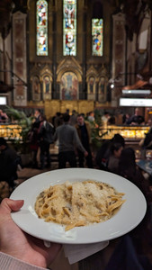 The last of my viral Instagram food places I needed to try was tucked in a market called Mercator Market. The market is a series of small vendors in a former cathedral. It was beautiful inside the cathedral and such a hipster vibe to have a market in a cathedral. The restaurant we chose was Dez Amore which served homemade pasta which they toss in a wheel of cheese before serving. The pasta was divine! We couldn't find seats because it was so crowded so we found a bar table to stand out as we ate our pasta leisurely.
