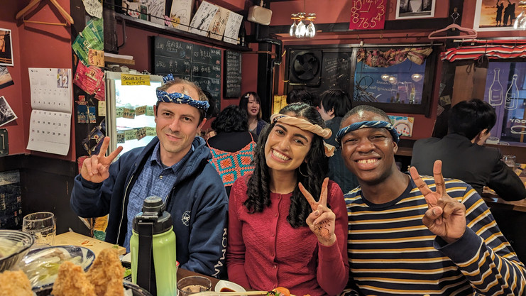 At some point a man named Henry was seated next to us. Henry was from the U.S. and at first had to adjust to the family we had become. Seated right next to us, the host made sure we became best friends and we're always talking. As a souvenir, the host gave us these cloth bands that you tie around your head and made us wear them for the duration of the meal. That meal was more than just a meal. It was a whole experience and the host made sure we had the time of our lives. We were laughing and joking the entire time and picked up more and more friends. The sushi was hand rolled right in front of us and was so good. Very fresh and the perfect quantity! My favorite part was when Suyi ordered sake and the host allowed him to fill up a massive cup and even finish the bottle.